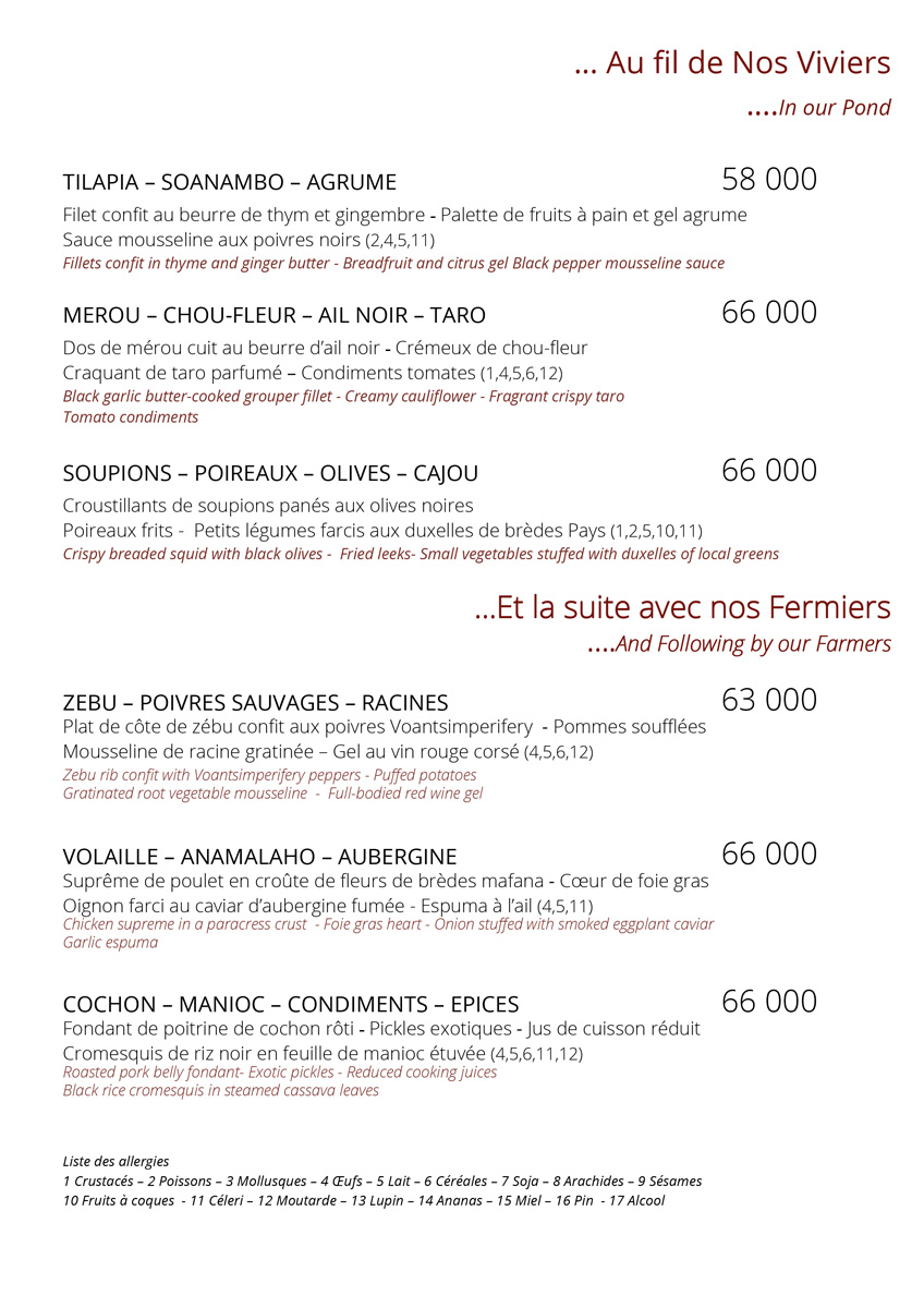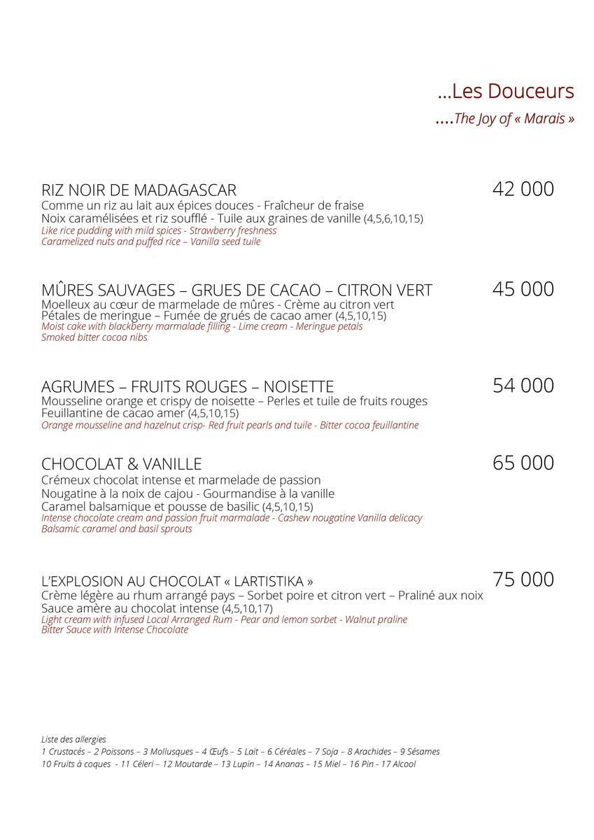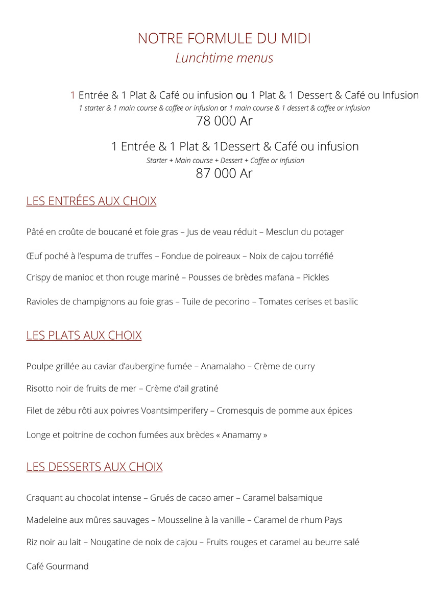 Amin’ny Ariary (MGA) TTC no anehoana ny saram-bidy, saingy ho fampahafantarana dia ampiarahina eo koa ny tetibidy amin’ny Euros (izay kajiana arakaraka ny taham-pifanakalozana ny androtr’iny). Isan’olona kosa ny saram-bidy ho an’ny sakafo.